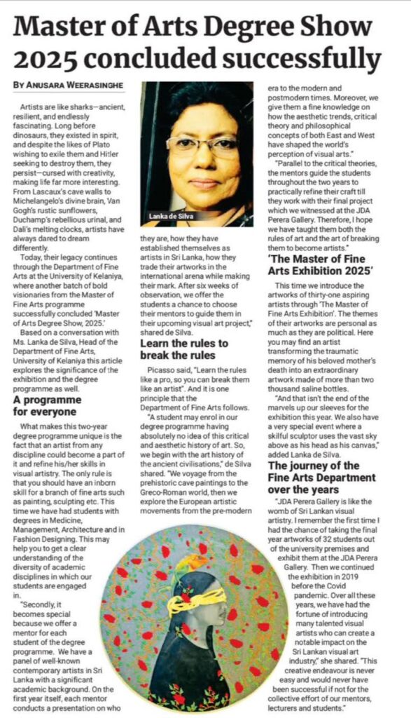 The Master of Fine Arts Degree Show 2025 of the University of Kelaniya showcased the artistic achievements of 31 postgraduate students. Held under the patronage of the Vice-Chancellor, the exhibition brought together a diverse collection of contemporary Sri Lankan art. From late June to early July 2025, visitors experienced bold explorations of identity, culture, and creativity that reflected the future of Sri Lanka’s fine arts.